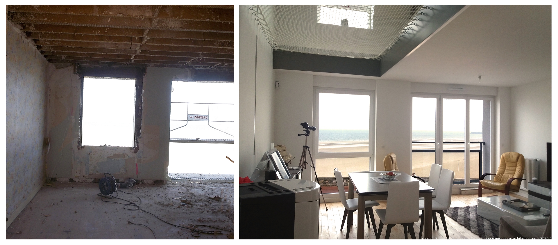 Dans son état initial, la maison présentait les espaces de vie au Rez-de-chaussée, et les chambres dans les étages et les combles, sur un modèle traditionnel. La maison étant en front de mer, la vue sur la plage est imprenable … sauf quand les camping-cars s’installent devant, pour en profiter eux-mêmes !